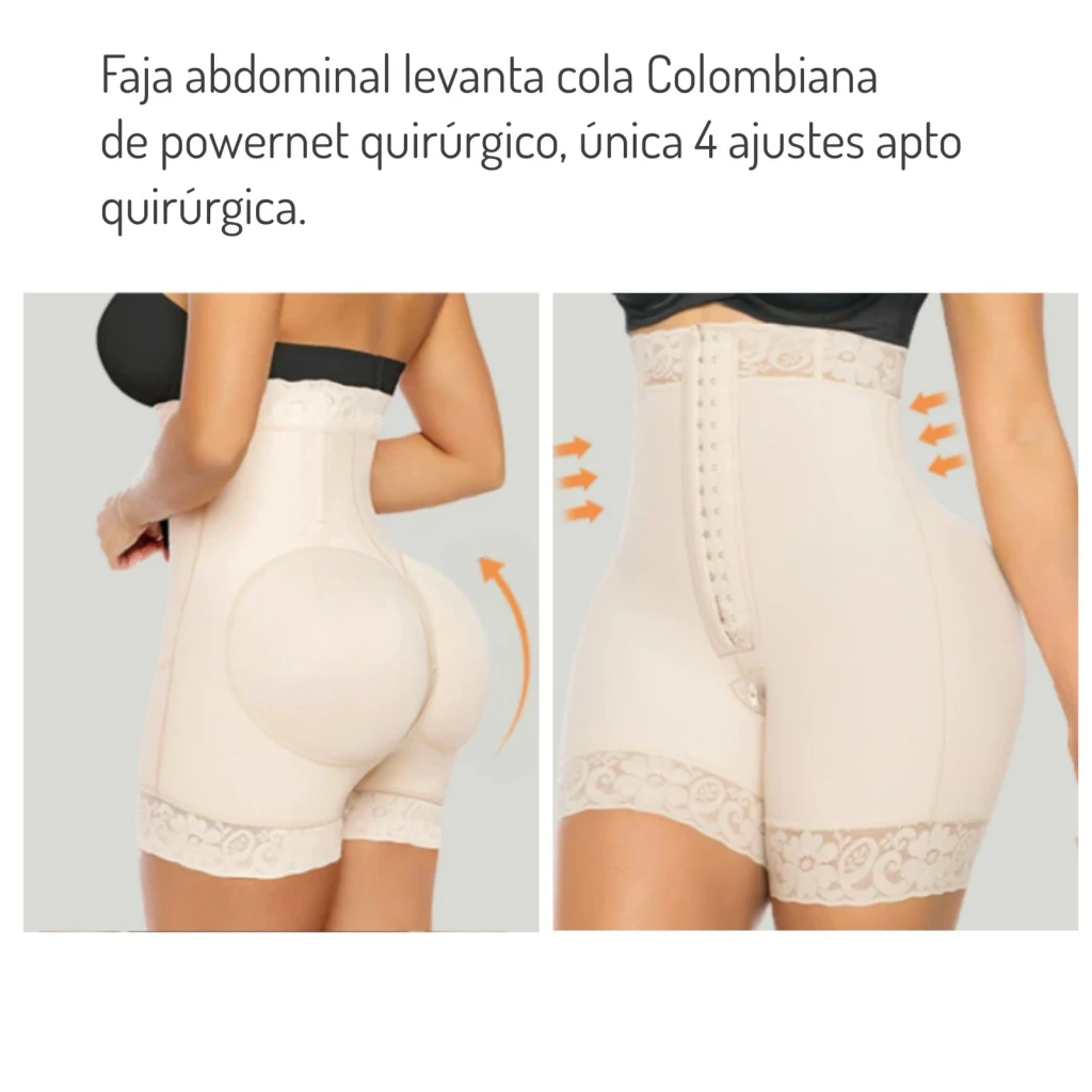 Faja abdominal colobiana de 4 ajustes de compresión alta, confeccionado en powernet quirurgico con corte levanta cola apto lipotransferencia y apertura perineal.